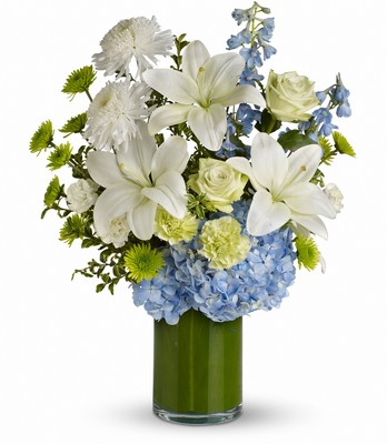 Cool as an ocean breeze, this beautifully serene bouquet features green roses, white lilies, and blue hydrangea in a stunning leaf-wrapped cylinder vase. It's like a vacation for the eyes and they'll adore it.